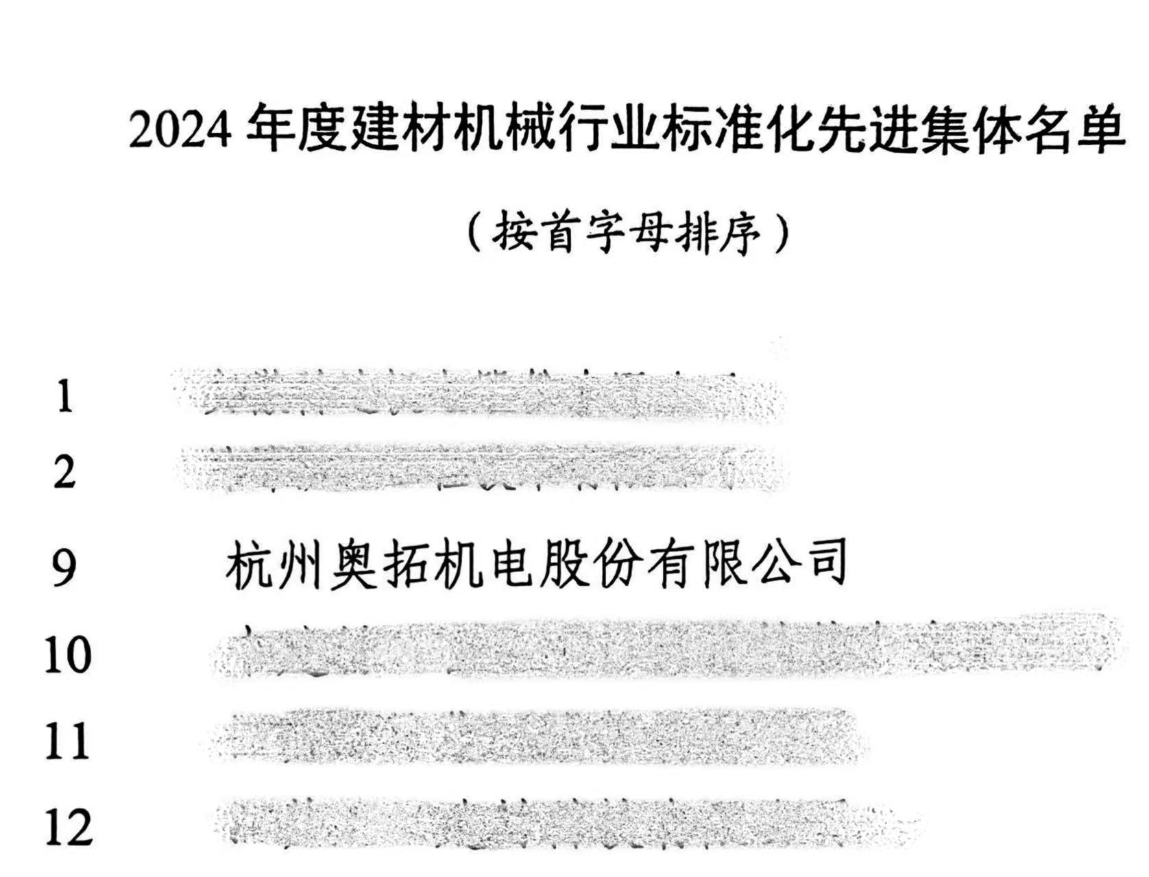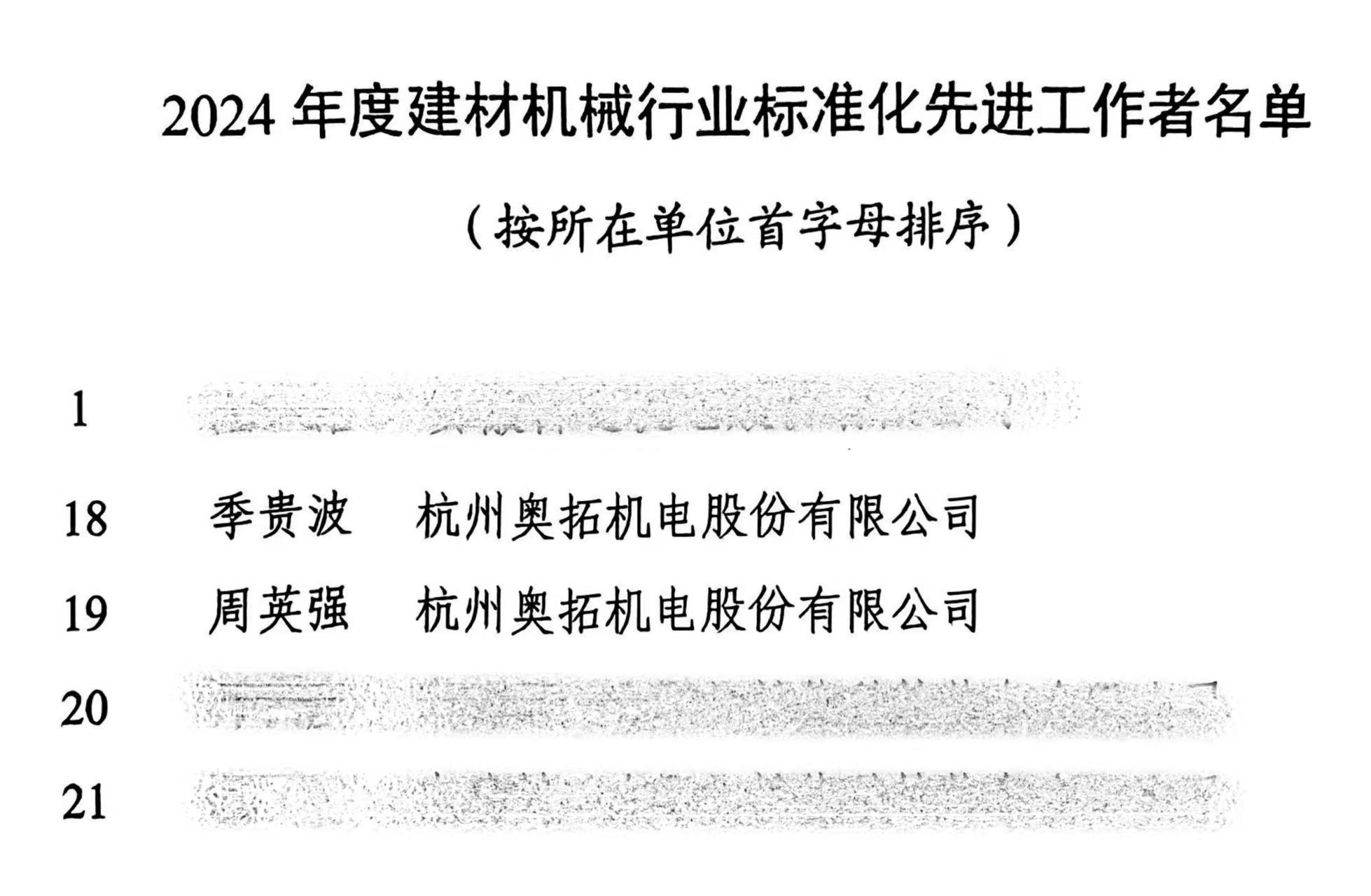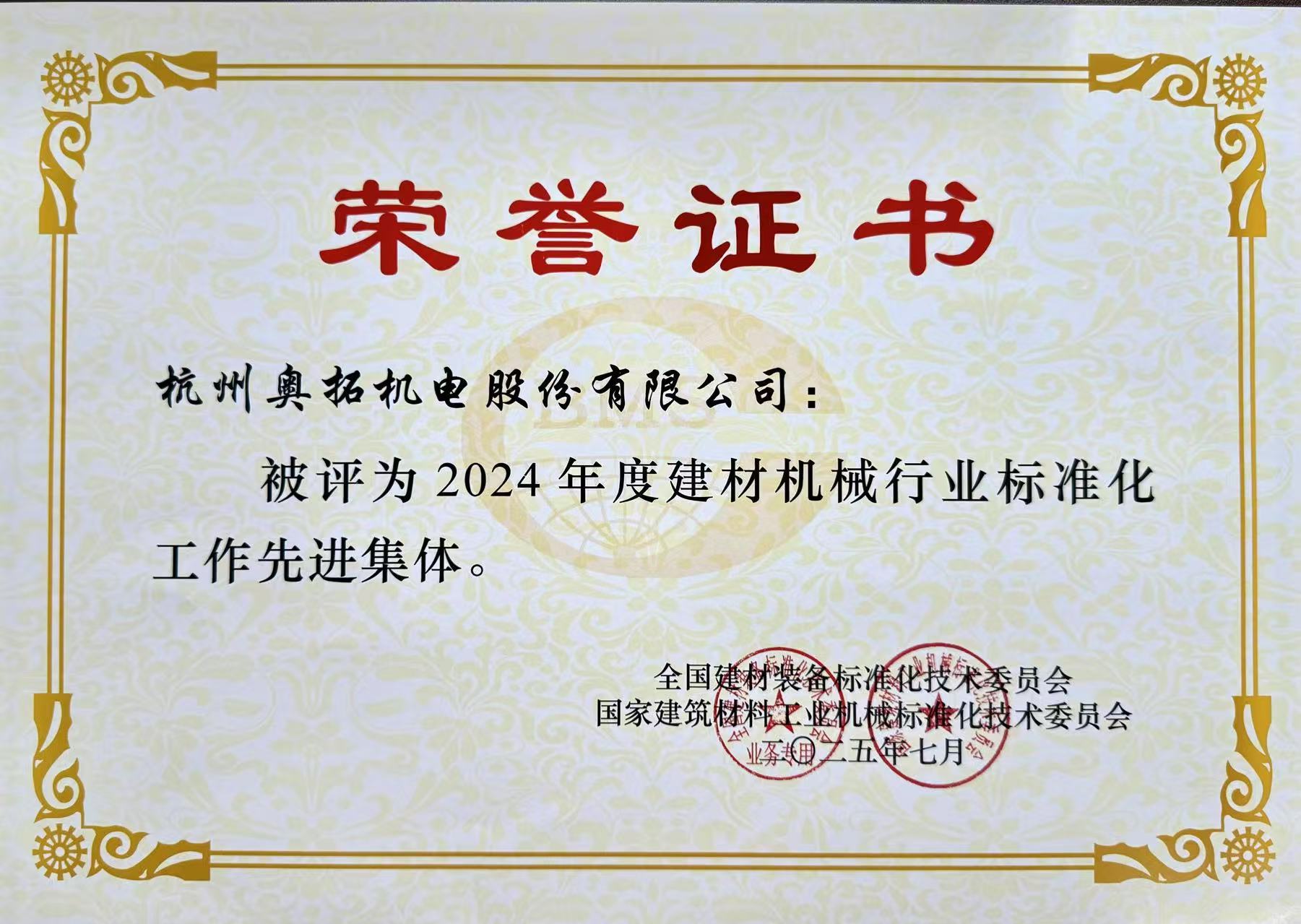 會議期間,為表彰在2024年度建材機械行業(yè)標(biāo)準(zhǔn)化工作中做出貢獻、積極參與標(biāo)準(zhǔn)化工作的集體和先進工作者,授予杭州奧拓機電股份有限公司等24家單位為“2024年度建材機械行業(yè)標(biāo)準(zhǔn)化工作先進集體”榮譽稱號。