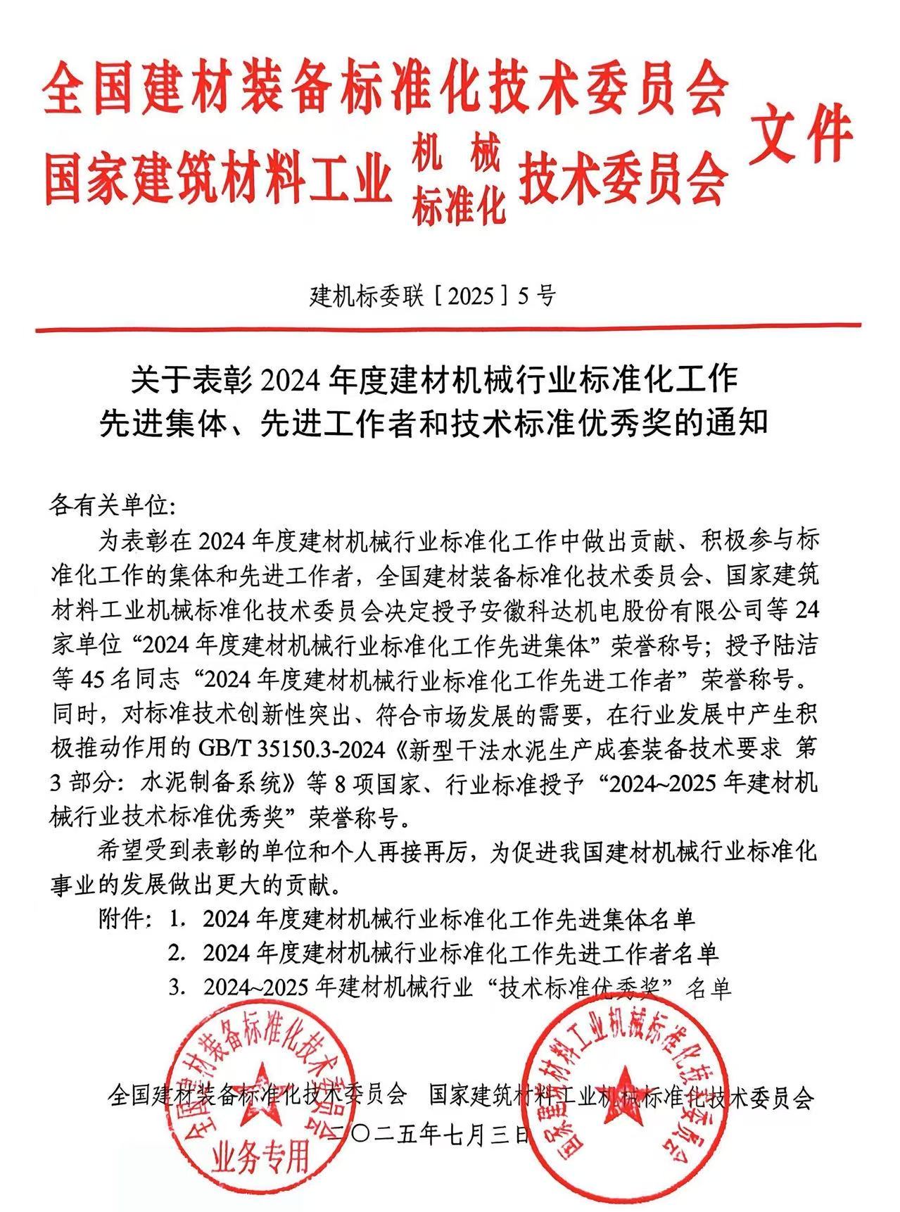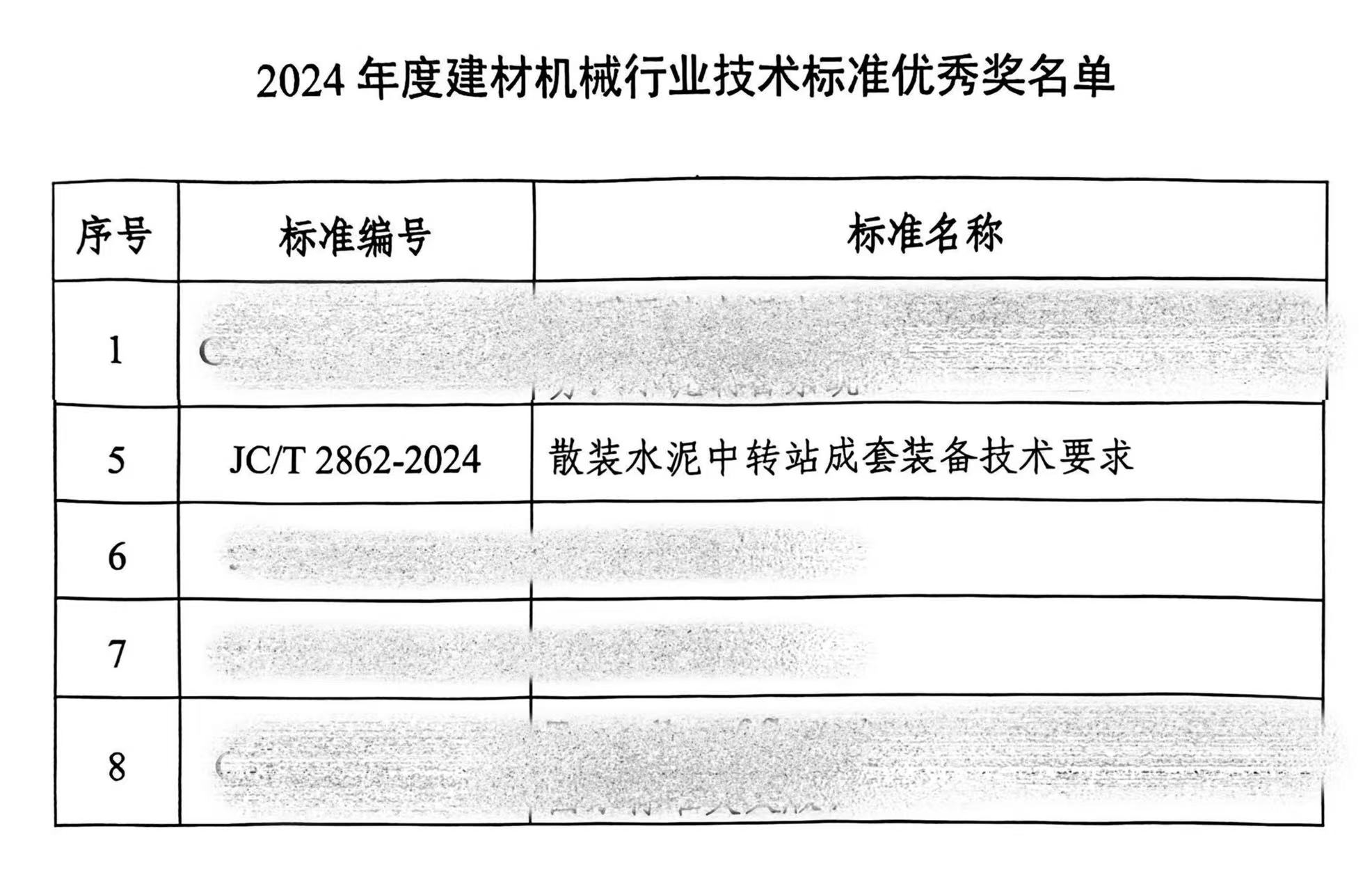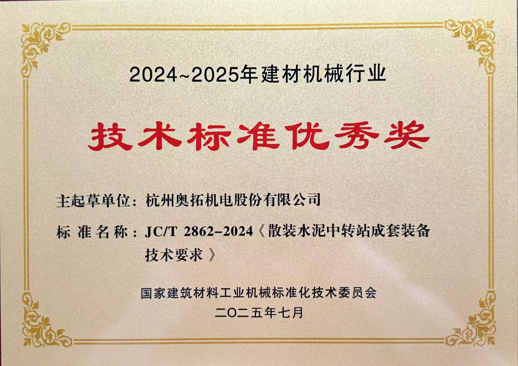 同時,對標(biāo)準(zhǔn)技術(shù)創(chuàng)新性突出、符合市場發(fā)展的需要,在行業(yè)發(fā)展中產(chǎn)生積極推動作用的JC/T 2862-2024《散裝水泥中轉(zhuǎn)站成套裝備技術(shù)要求》等8項國家、行業(yè)標(biāo)準(zhǔn)授予“2024~2025年建材機械行業(yè)技術(shù)標(biāo)準(zhǔn)優(yōu)秀獎”榮譽稱號。