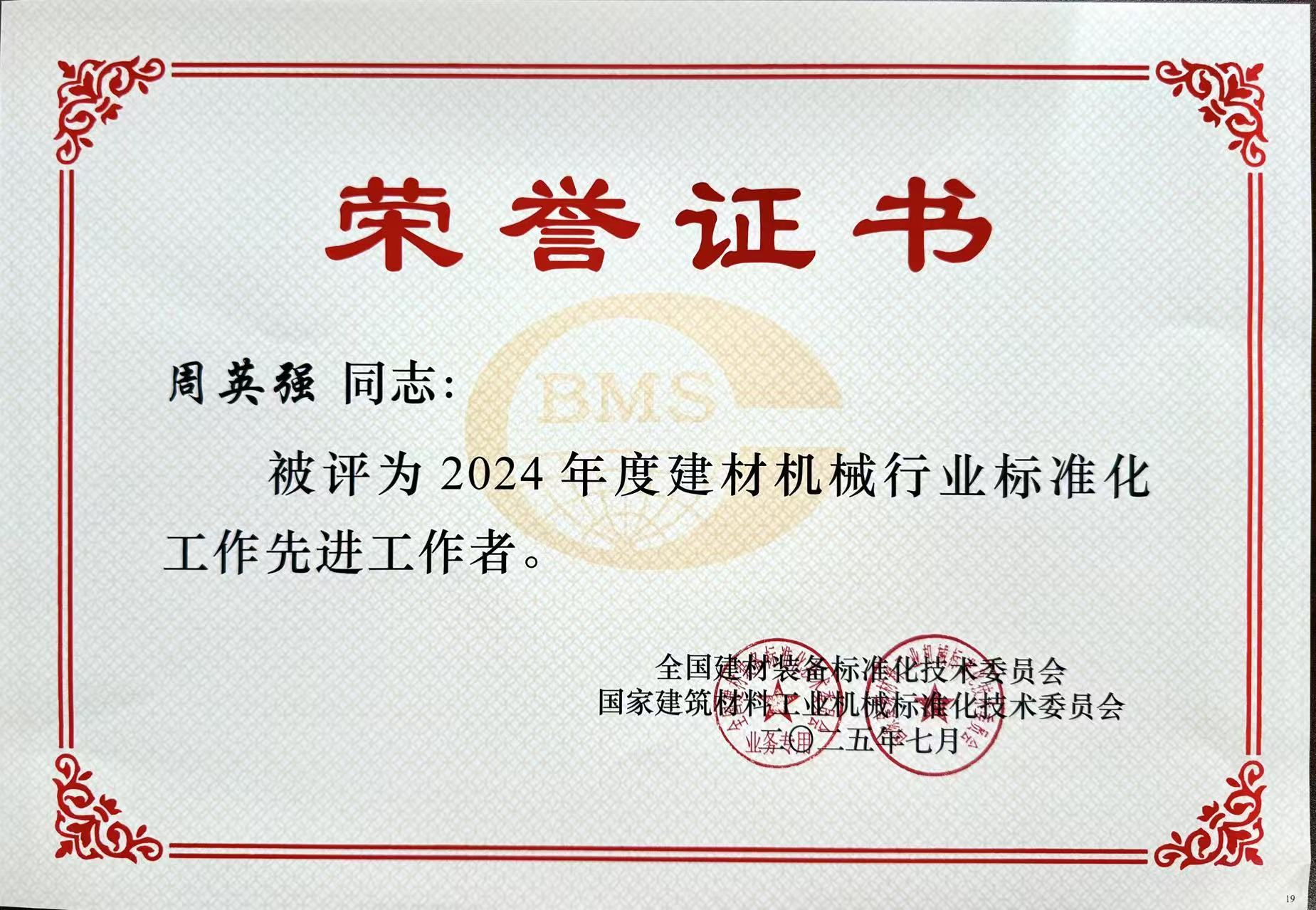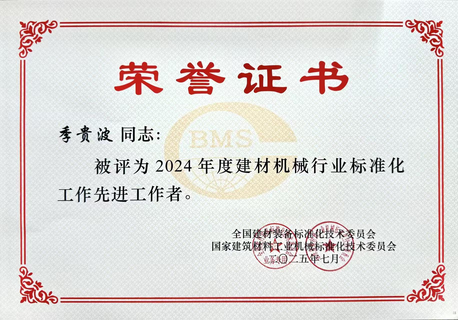 其中,奧拓股份董事長季貴波、研究院科研管理室主任周英強獲得“2024年度建材機械行業(yè)標(biāo)準(zhǔn)化工作先進工作者”表彰。